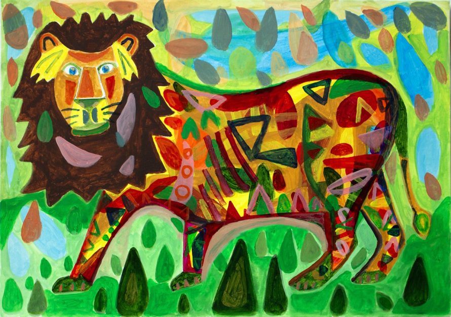 力強い筆致と鮮やかな色彩で描かれたライオンは、見る者に元気と勇気を与えてくれる素晴らしい作品です。