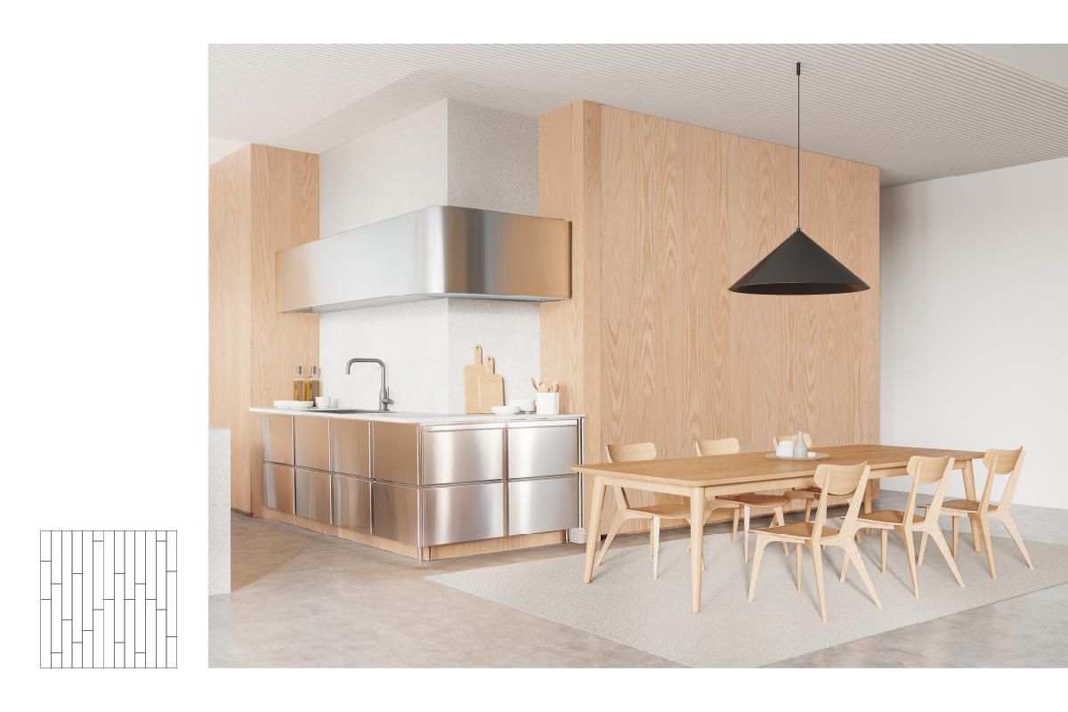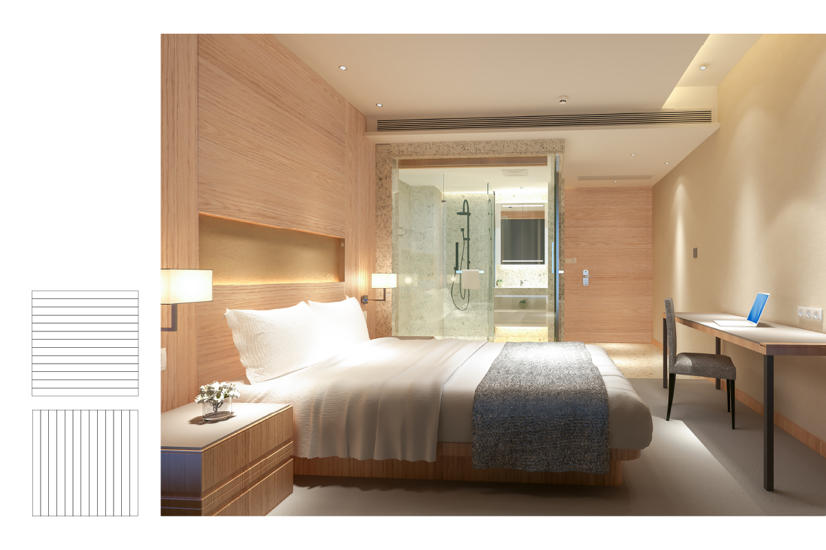 空間全体に温もりと力強さをもたらします。厳選された美しい突板は躍動感と重厚感ある上質な空間を演出します。